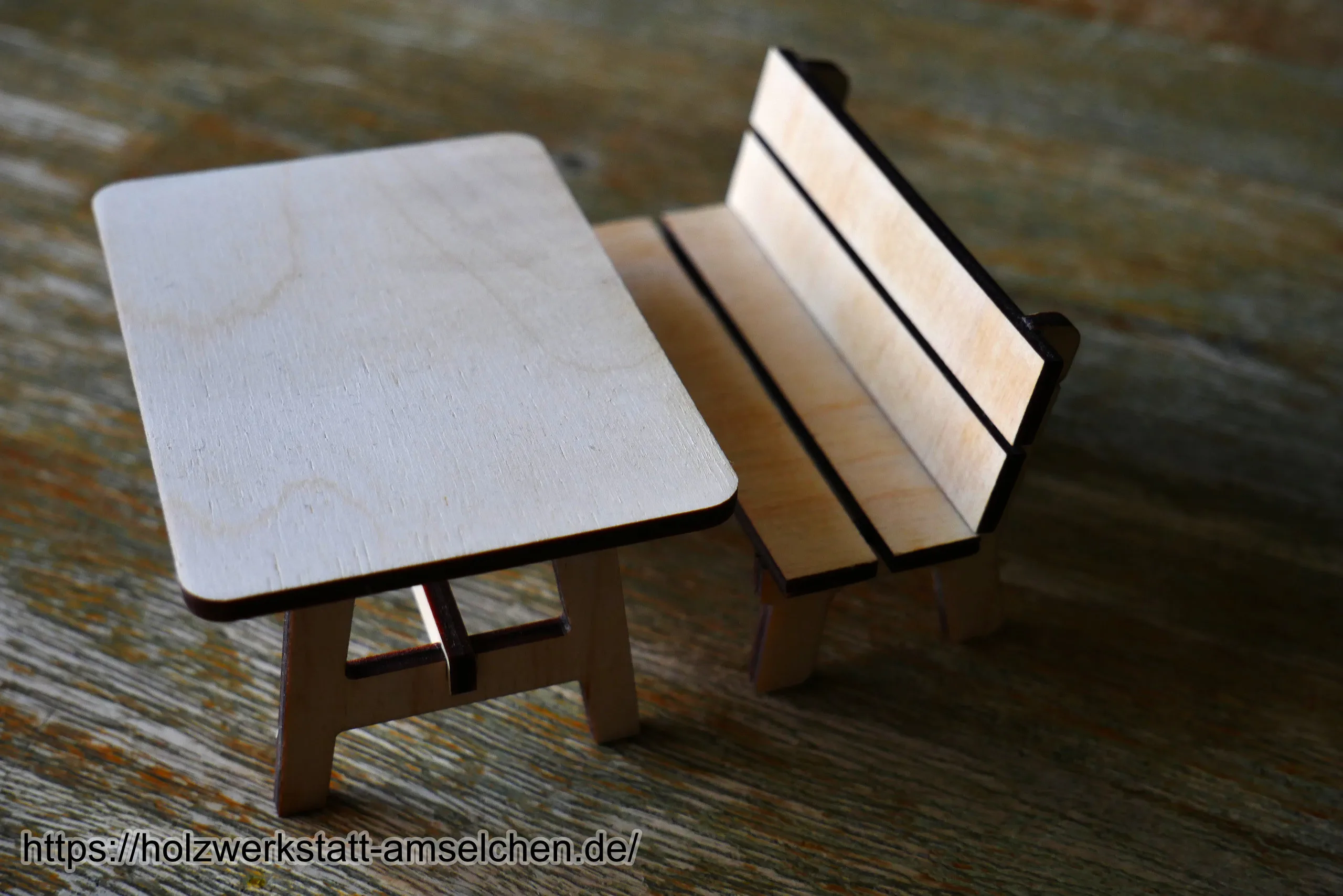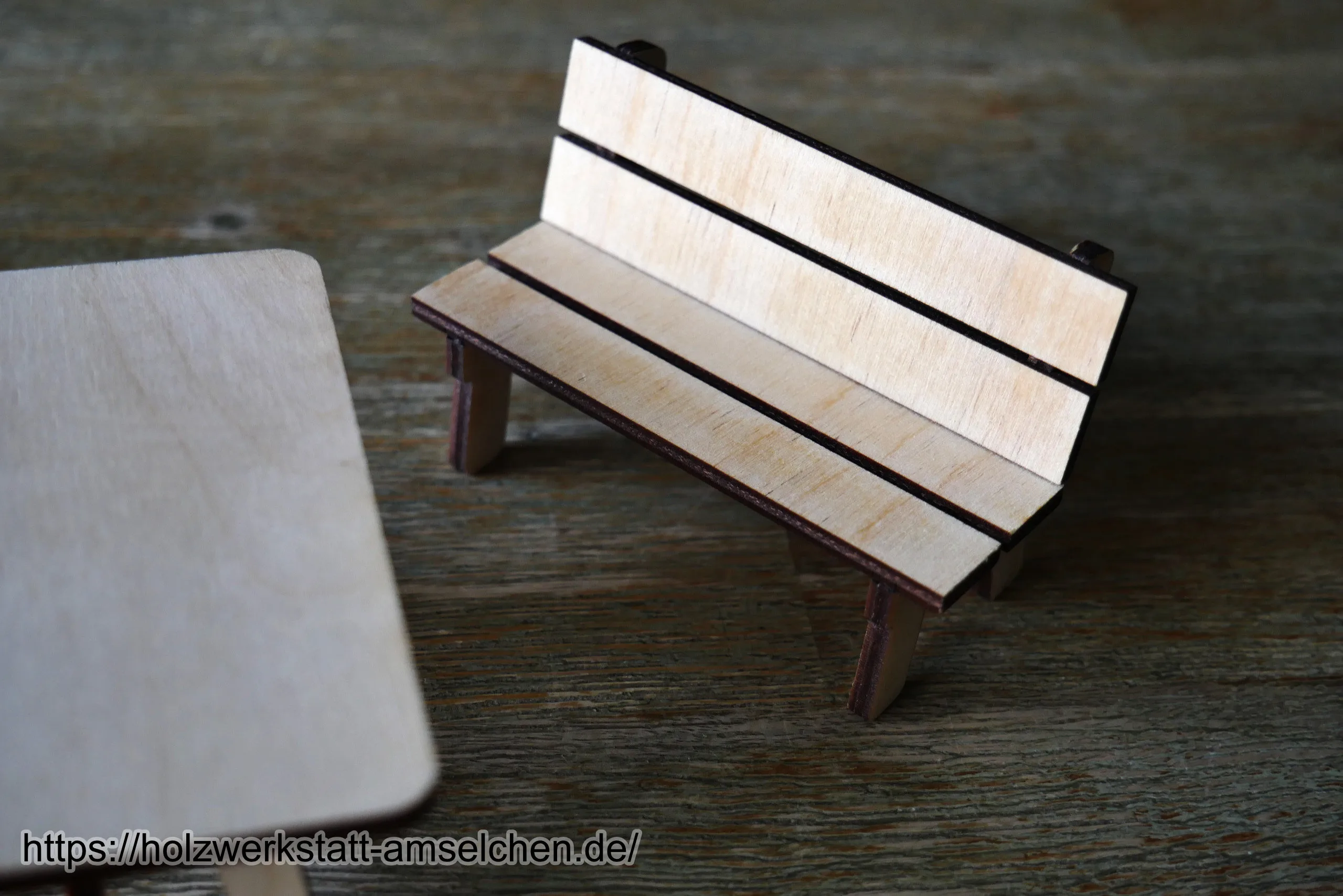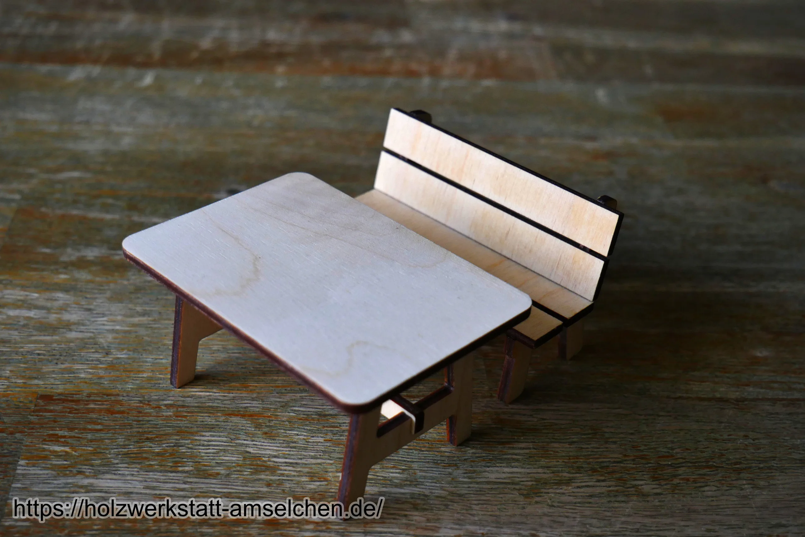 Die Miniatur-Wichtelbank sowie das dazugehörige kleine Tischchen werden in Einzelteilen mittels Laser aus naturbelassenem Birkensperrholz geschnitten und anschließend von Hand verleimt.