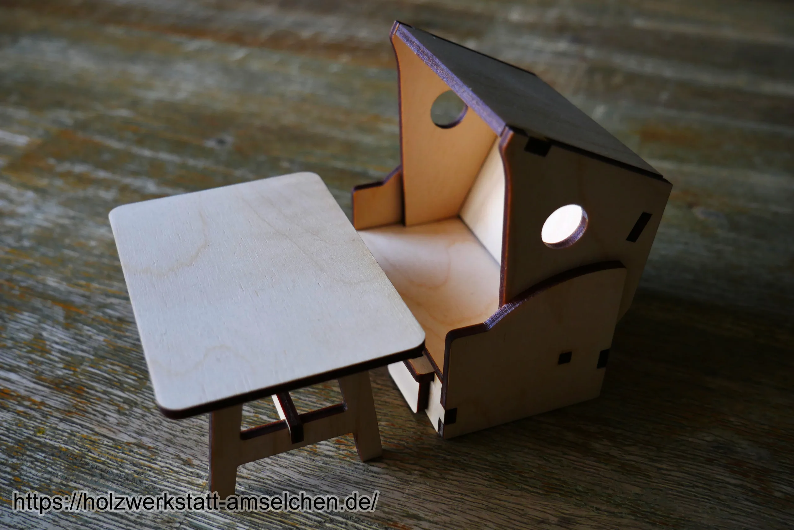 Kleiner Strandkorb mit Tischchen aus Birkensperrholz, passend zu deiner Wichteltür.