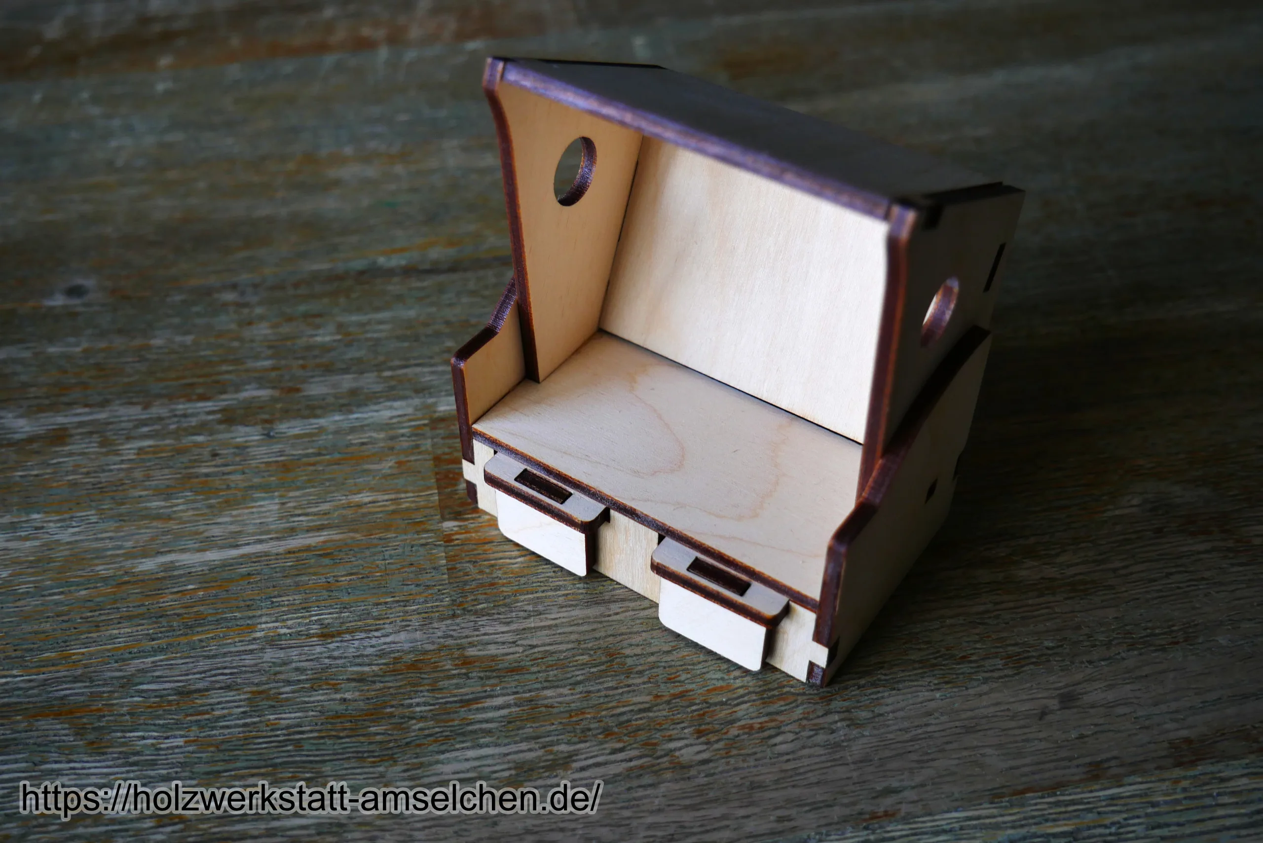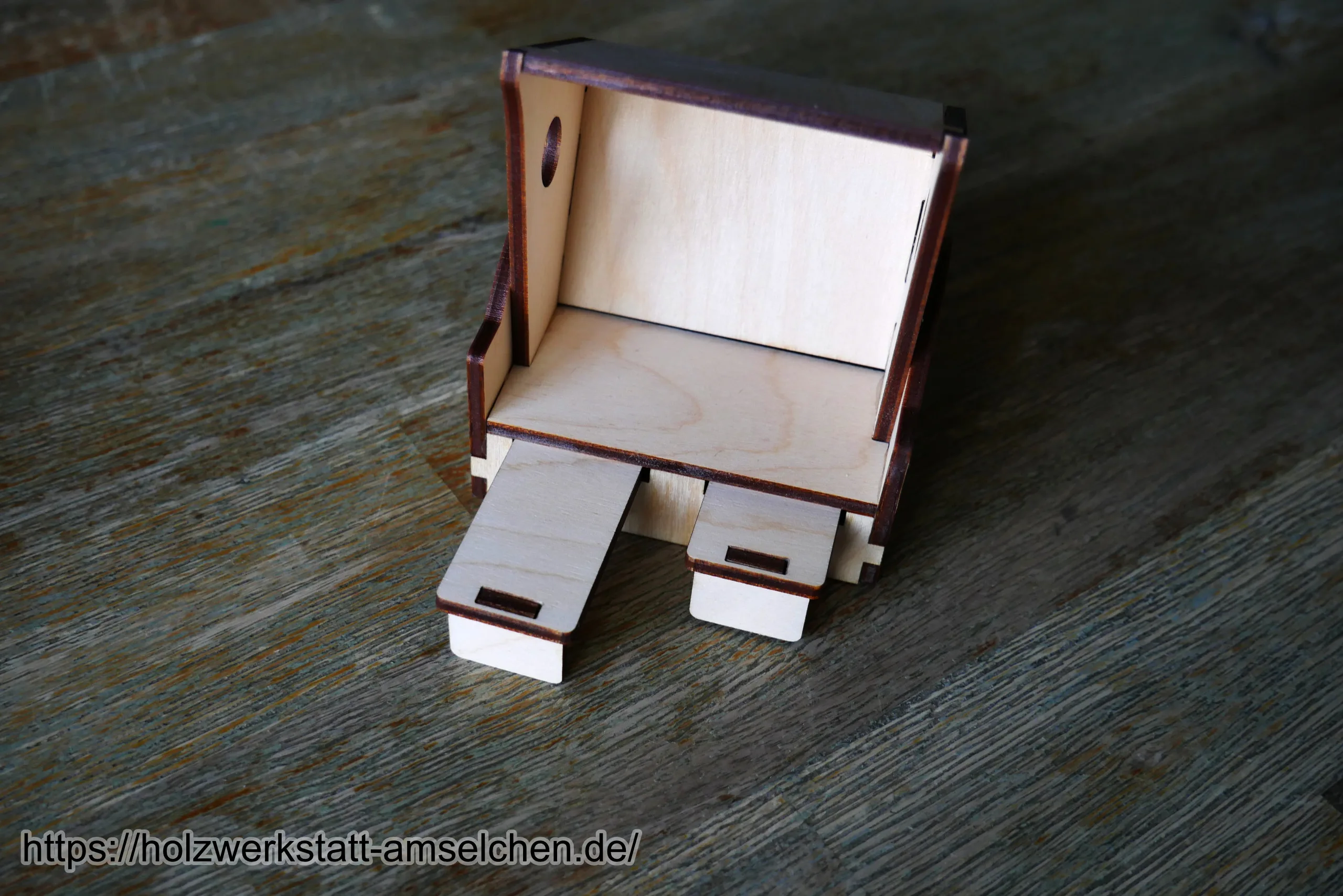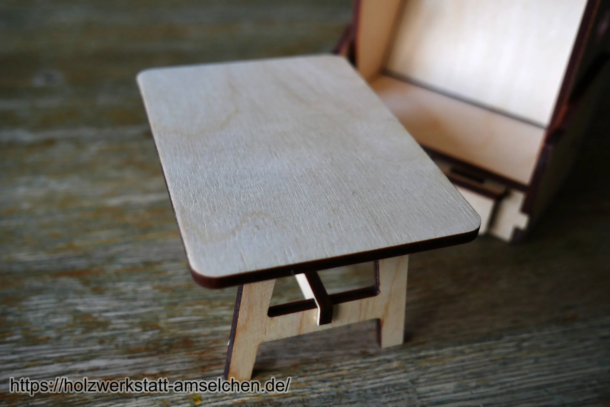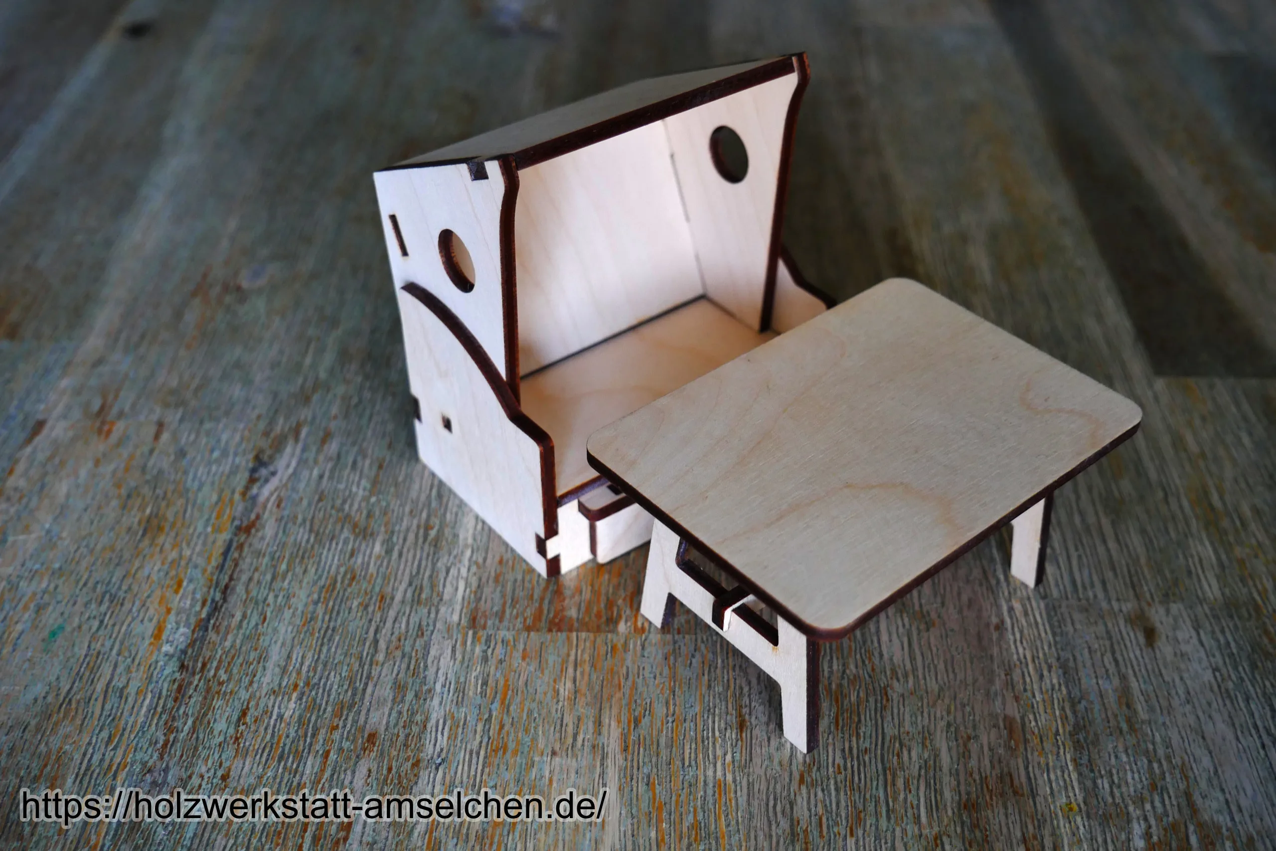 Der Miniatur-Strandkorb sowie das dazugehörige kleine Tischchen werden in Einzelteilen mittels Laser aus naturbelassenem Birkensperrholz geschnitten und anschließend von Hand verleimt.