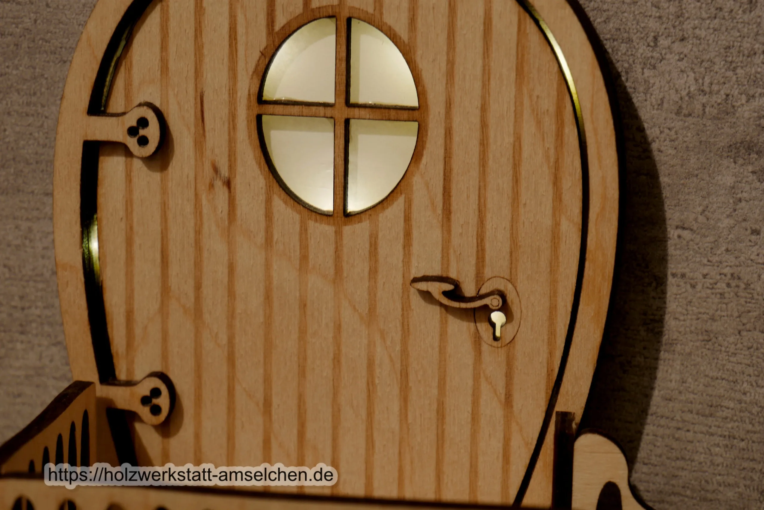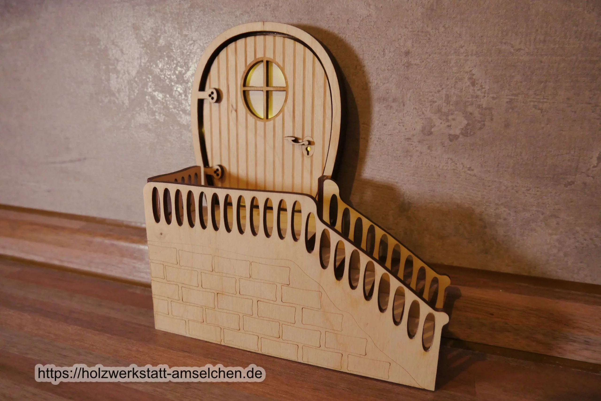 Wichteltür mit oder ohne Beleuchtung und Treppe aus Birkensperrholz zum Hinstellen.