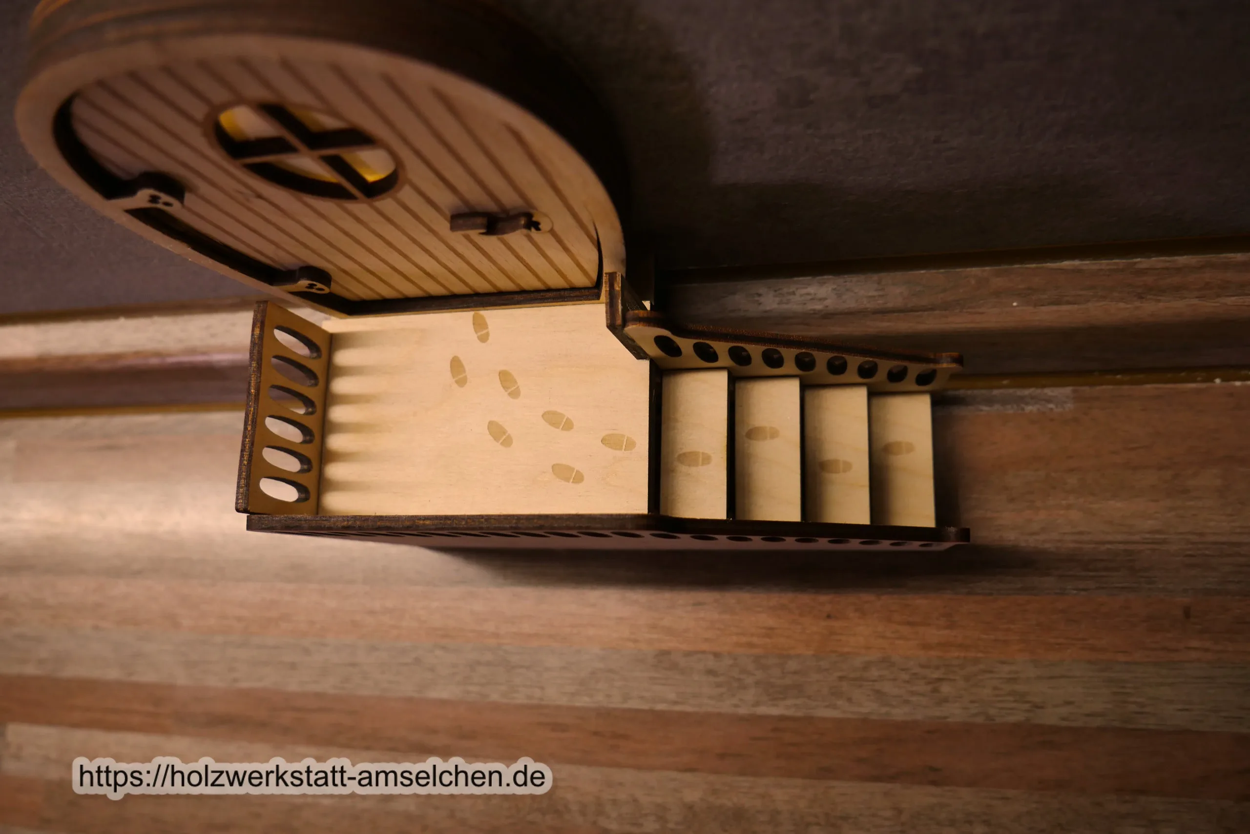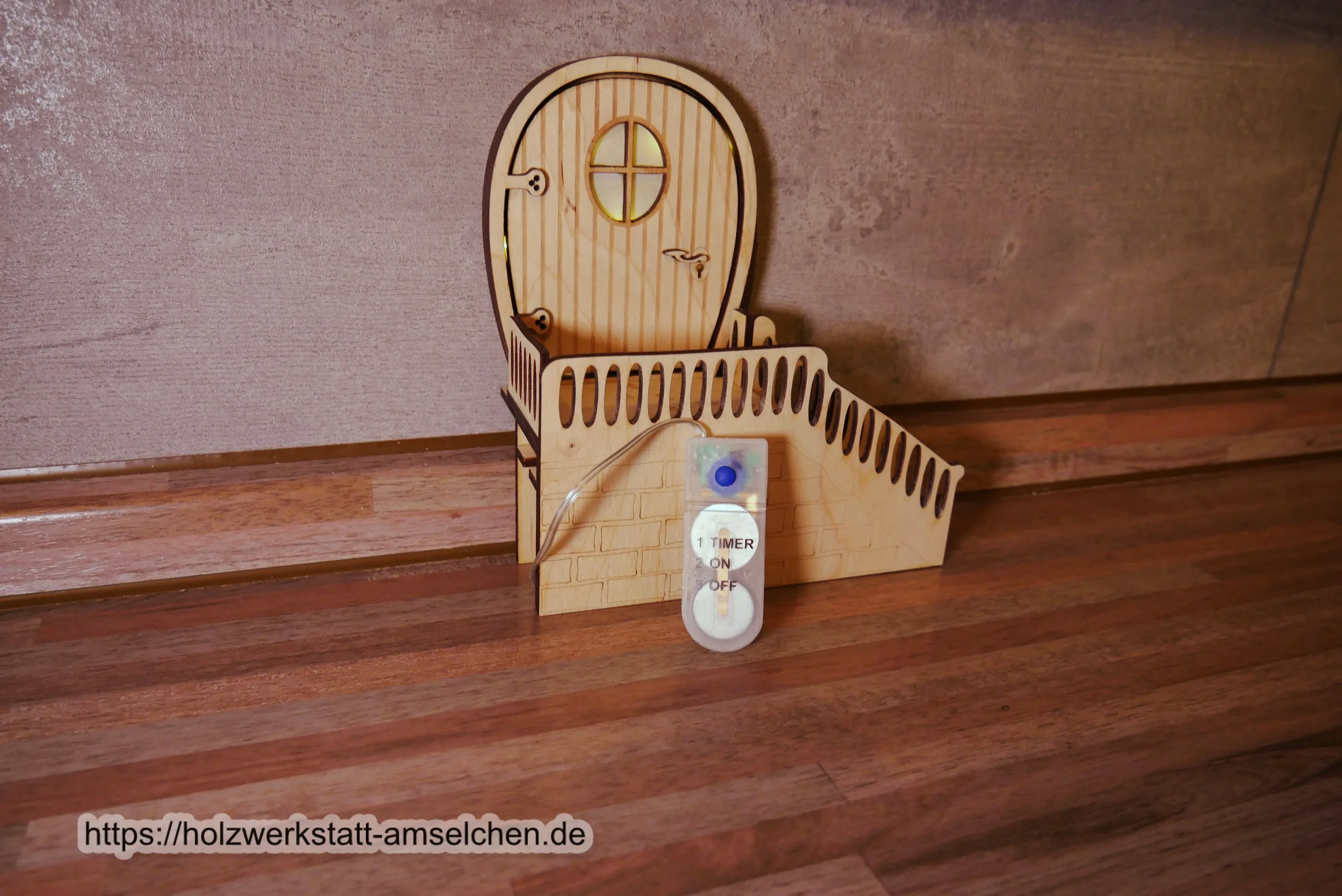 Die Wichteltür wird in Einzelteilen aus naturbelassenem Birkensperrholz gelasert und anschließend von Hand verleimt. Außerdem wird eine kleine LED-Lichterkette eingebaut, die durch die integrierte Timerfunktion den Einzug des Wichtelchens für die Kleinen und Großen glaubhaft macht. Das Batteriefach der Lichterkette ist nach außen kaum sichtbar in der Treppenkonstruktion versteckt, kann aber zum bequemen An- bzw. Ausschalten oder zum einfachen Batteriewechsel herausgenommen werden. Ebenfalls ist es möglich, die Beleuchtung von unten ohne Herausnehmen an- oder auszuschalten. Betrieben wird sie mit 2 Knopfzellbatterien (CR2032). Nach Betätigen der Timerfunktion leuchtet die Lichterkette 6 Stunden dauerhaft und schaltet sich anschließend automatisch für 18 Stunden aus. Die besondere Konstruktionsweise der Wichteltür sorgt dafür, dass sie frei im Raum stehen kann, nicht an die Wand angeklebt werden muss und für Fußleisten von 4,5cm Höhe und 2cm Tiefe geeignet ist.